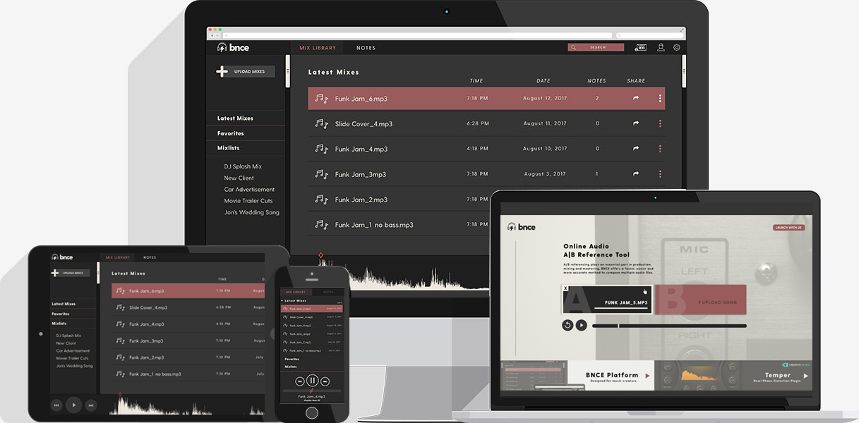 Designed for music creators, BNCE makes sharing audio files and organizing personal libraries of mixes easy, fast and affordable. Whether you're a professional, or a bedroom producer or both, the BNCE Platform provides users with reliable cloud-storage and syncing, for easy accessibility and listening on all devices.